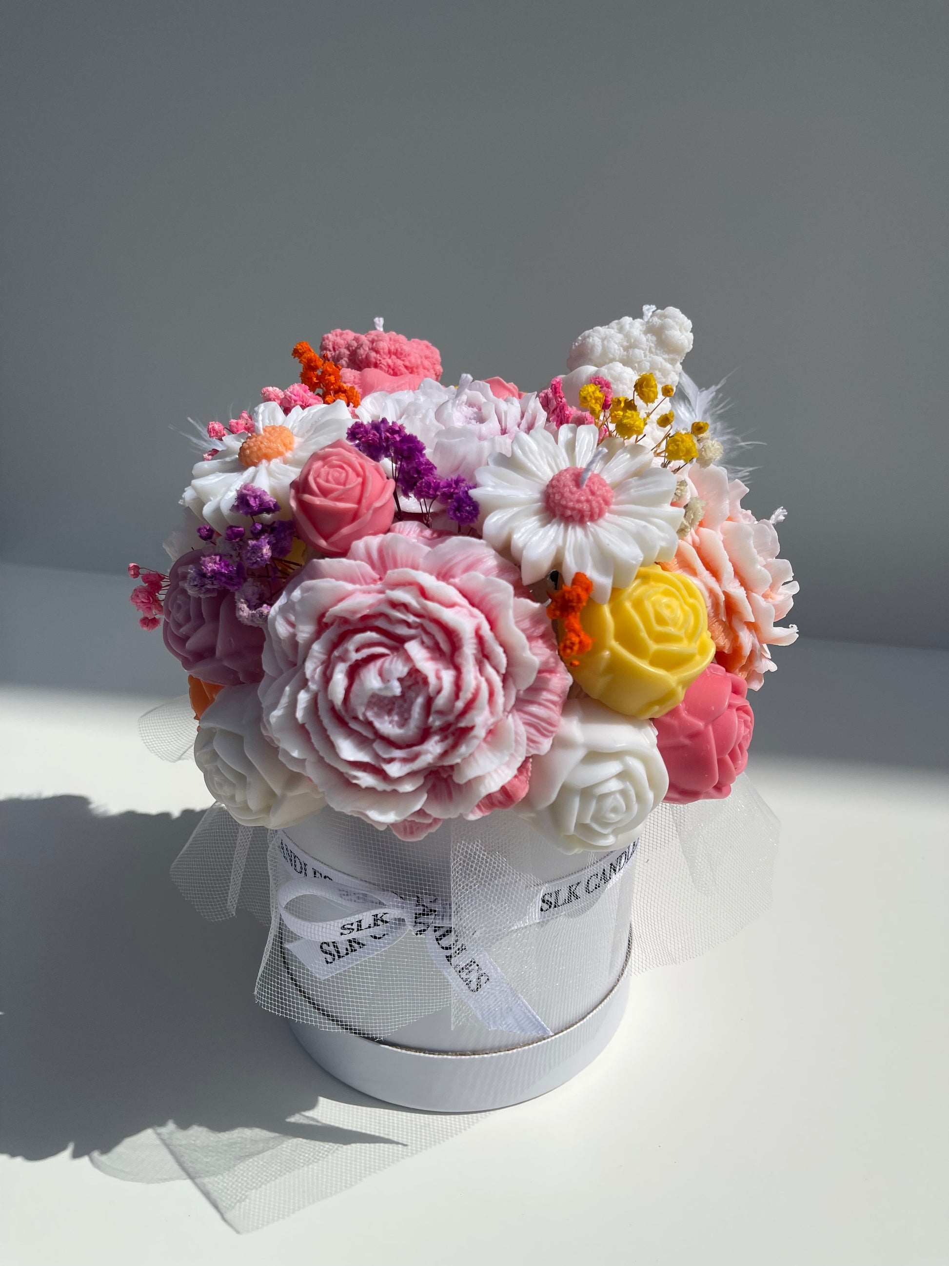 Nestled within a stylish white hat box, and delicately finished with a signature SLK Candles ribbon, this candle bouquet is a true testament to refined taste. It's classic aesthetic is sure to captivate any recipient.